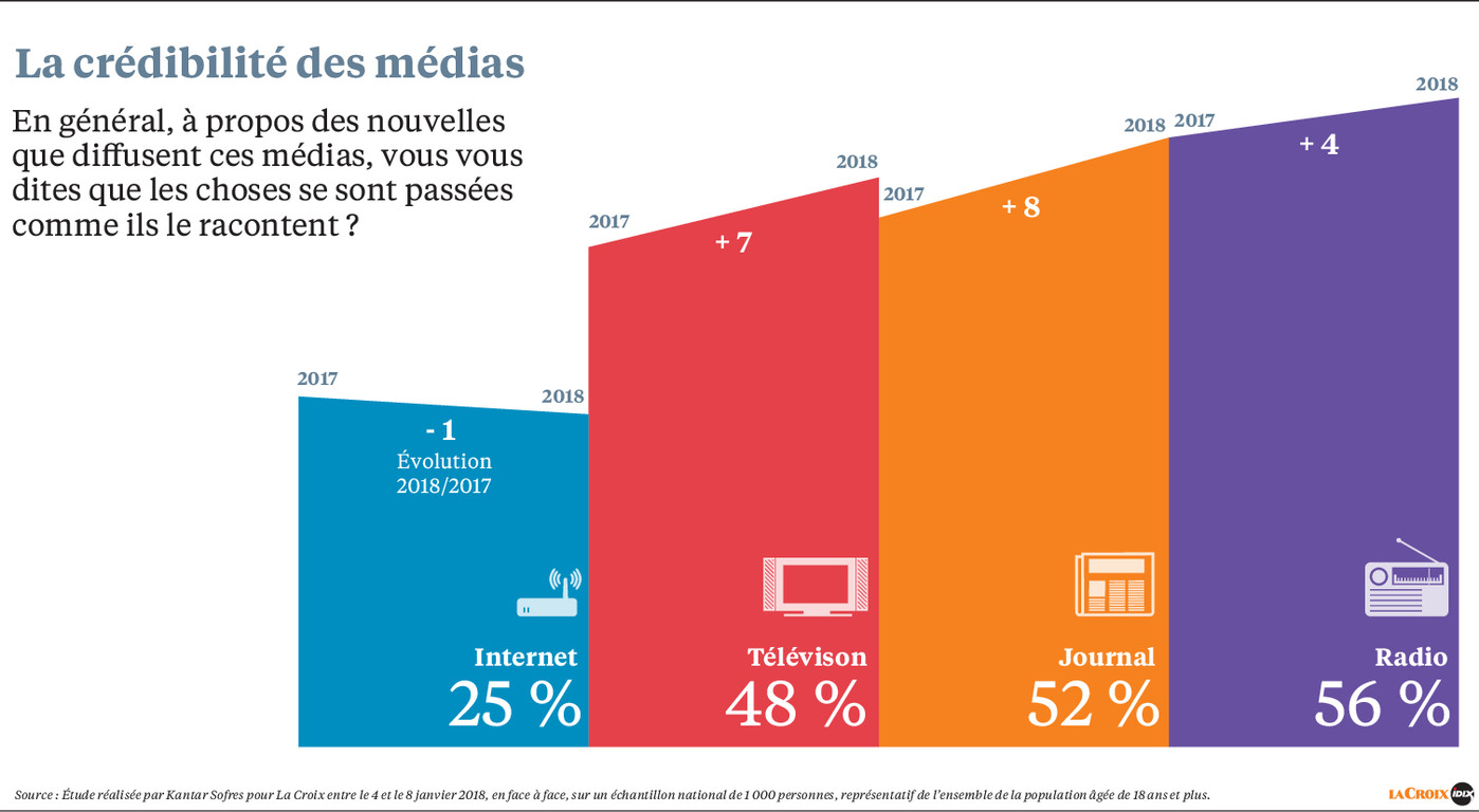 La Croix a publié son 31e Baromètre de confiance dans les médias, réalisé par Kantar/Sofres. Les Français attendent des médias qu’ils leur fournissent une information de qualité et fiable. C’est le résultat du baromètre qui révèle un progrès de la crédibilité des médias traditionnels : la presse écrite (52 %, + 8 %), la télévision (48 %, + 7 %), la radio (56%, + 4%). Au contraire, Internet n’attire pas la confiance des Français. Seuls 25% du public sondé jugent crédible l’information disponible via internet.