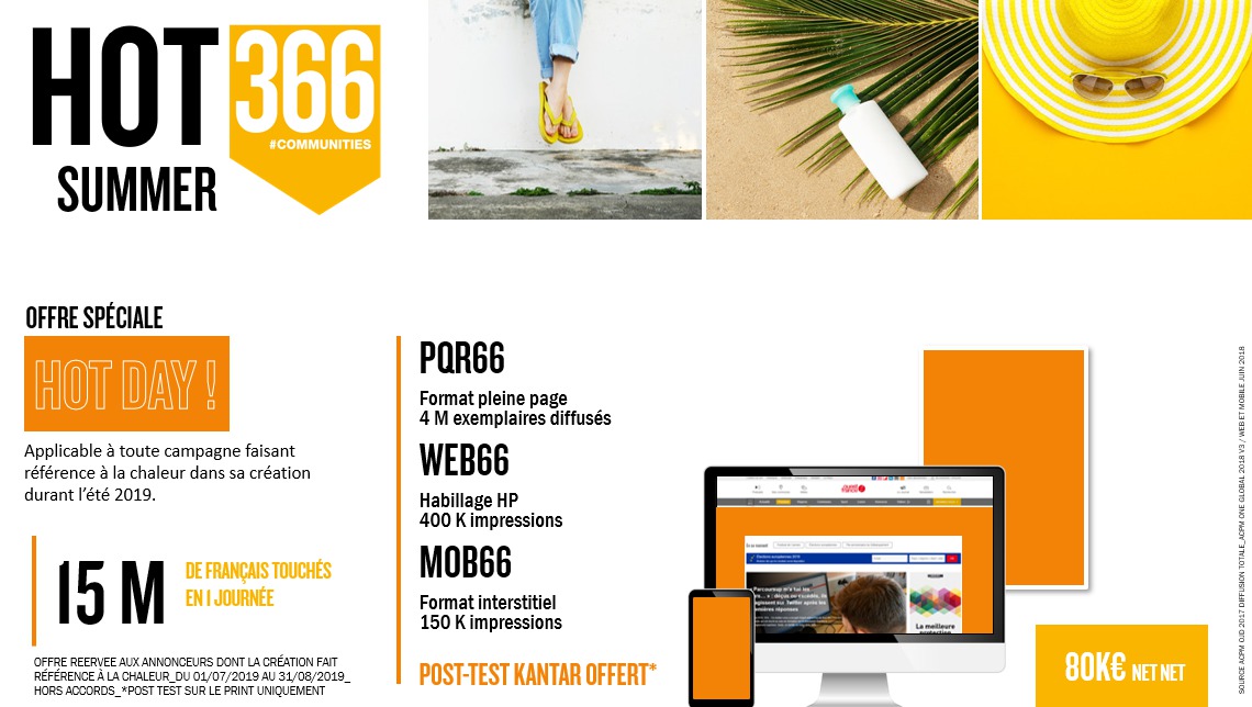 La régie 366 propose aux annonceurs d’être présents sur l’été 2019 (du 1er juillet au 31 août) au travers de 3 offres sur un principe de doublement d’espace : 1 espace acheté = 1 espace offert, sur le print comme le digital. Elles sont soumises à condition et pourront seulement être déclenchées lorsque la température dépassera 25°C !