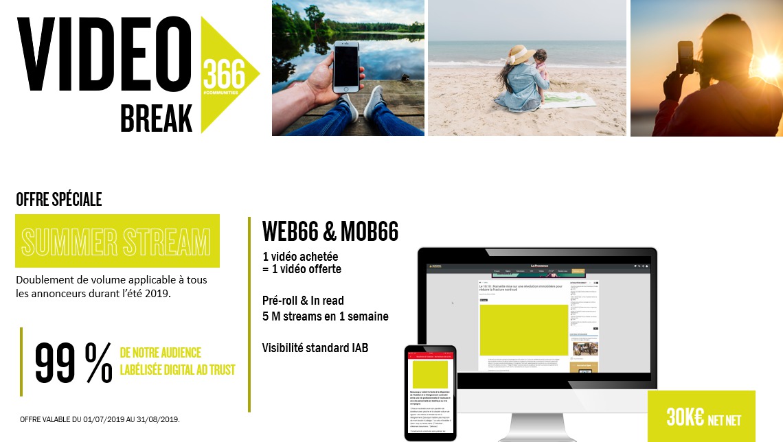 Video break, troisième offre, concentre 5 millions de streams en une semaine en formats pré-roll et in-read. Une offre spéciale été sur l’ensemble des sites de presse quotidienne régionale, dont 99% de l’audience est labellisés Digital Ad Trust.