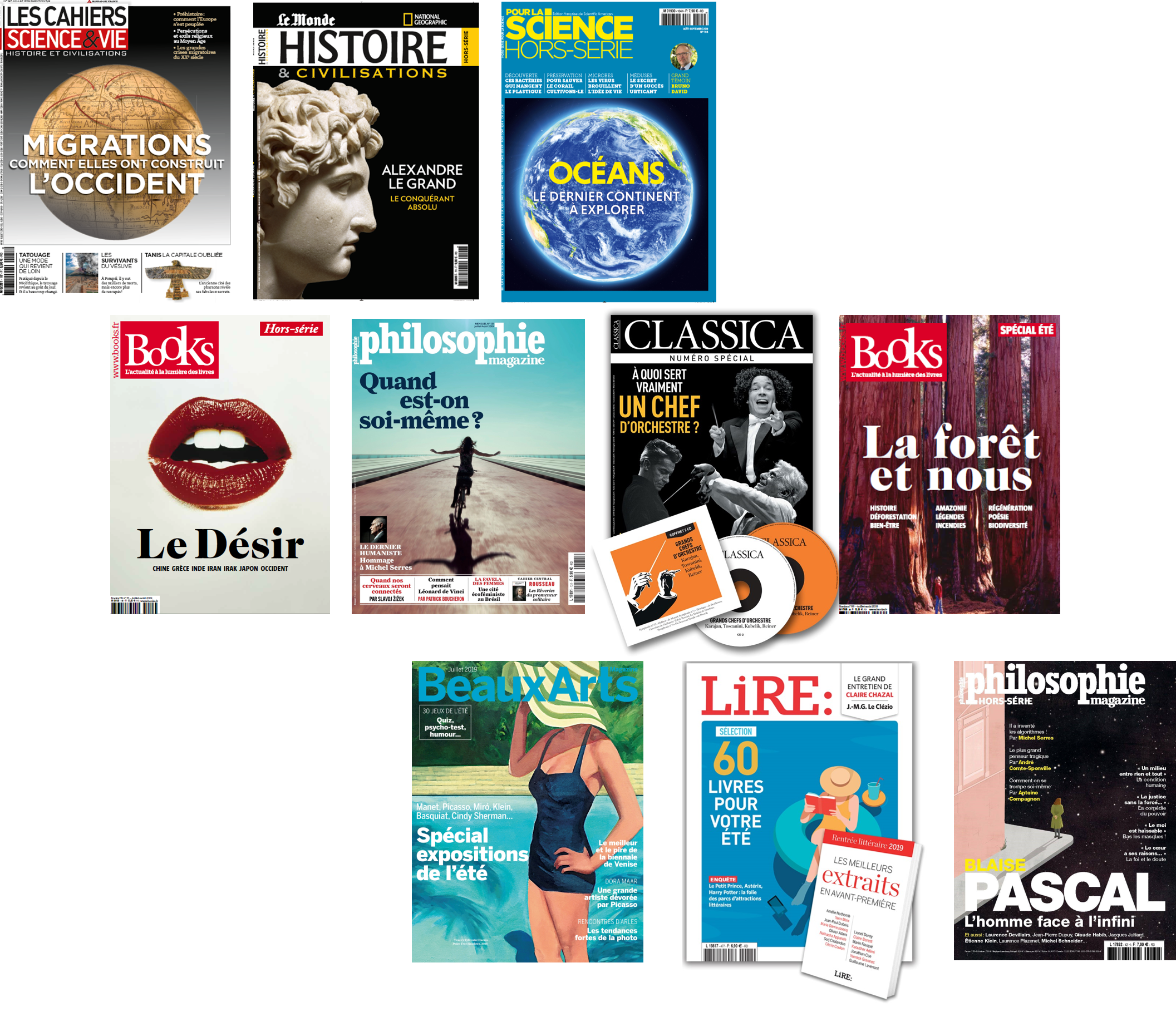 Les titres participants sont : Beaux Arts Magazine, Classica, Histoire & Civilisations, Lire, Pour La Science Hors-Série, Les Cahiers Science & Vie, Books Mensuel Et Hors-Série, Philosophie Magazine Mensuel Et Hors-Série.