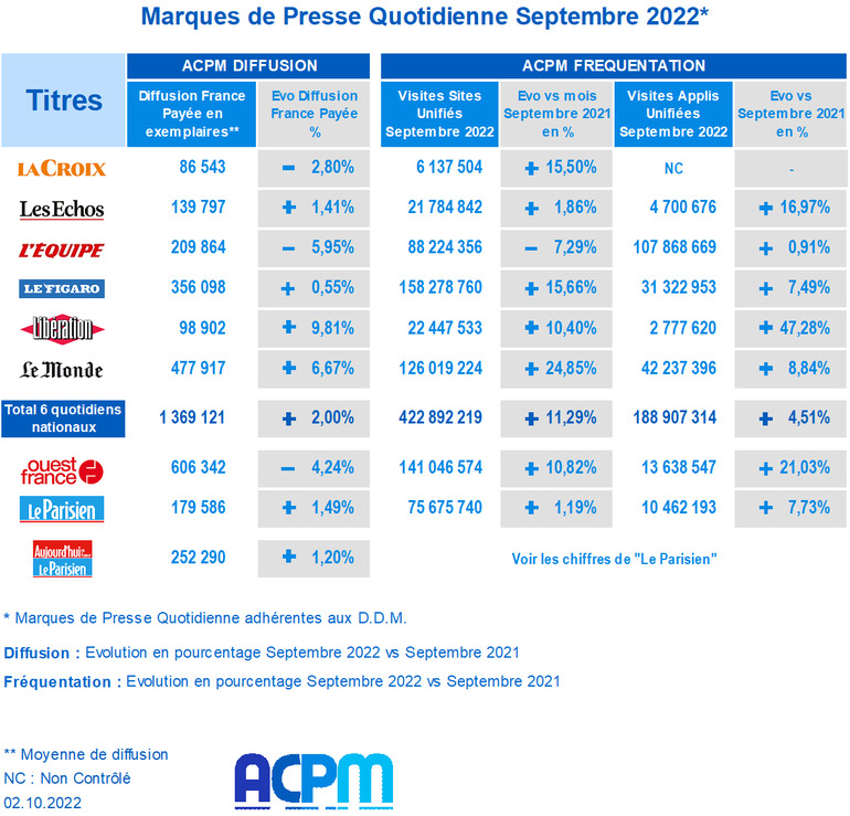 L’ACPM a publié les chiffres de diffusion et de fréquentation des marques de Presse Quotidienne pour le mois de septembre.