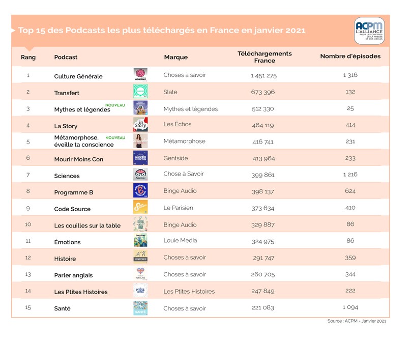 ACPM : classement des podcasts pour janvier 2021