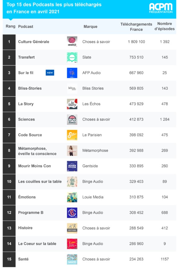 Ce mois-ci, l’ACPM accueille 3 nouveaux podcasts : Sur le Fil de AFP Audio, Le Système de Slate et Sexcast de L’Indépendant. Sur le podium on retrouve le podcast Culture Générale avec plus d’un million de téléchargements, suivi de Transfert et Sur le fil.