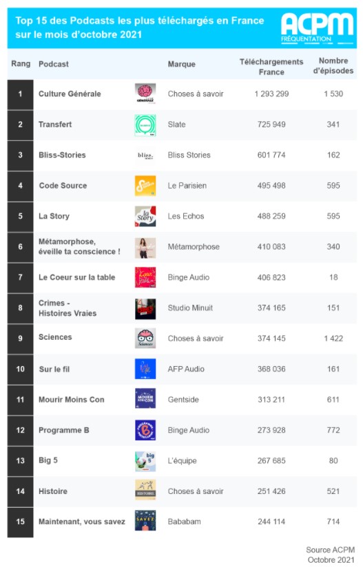L’ACPM vient de partager les chiffres de diffusion des 259 podcasts certifiés sur le mois d’octobre 2021.