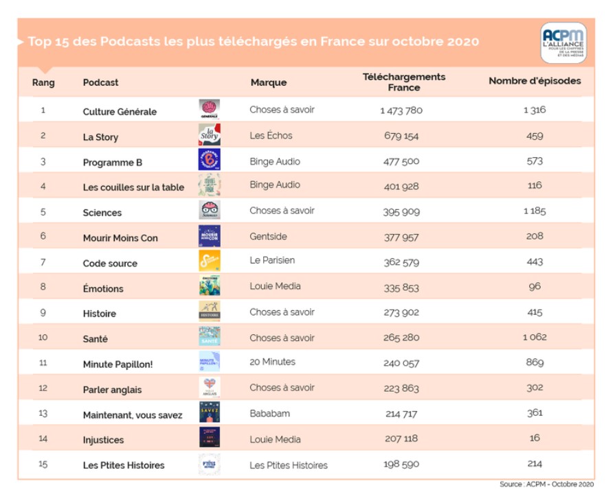 Voici le top 15 des podcasts les plus écoutés ce mois-ci :