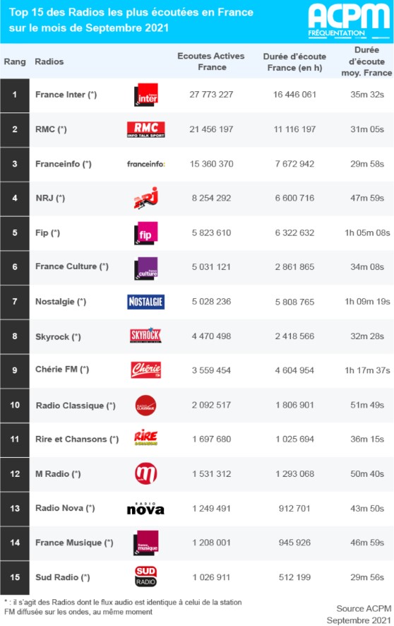 Top 15 des radios digitales les plus écoutées pour septembre 2021