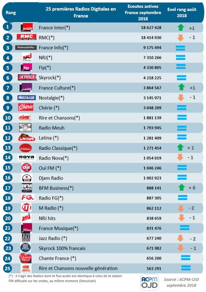 L’ACPM a publié les chiffres de diffusion des radios digitales certifiés sur le mois de septembre. La consommation numérique de la radio progresse de 5,4 % en septembre 2018. Les assistants vocaux qui s’installent dans les premiers foyers français participent certainement à cette progression. 122 millions de sessions d’écoutes actives (de plus de 30 secondes) ont été comptabilisées sur le seul mois de septembre.