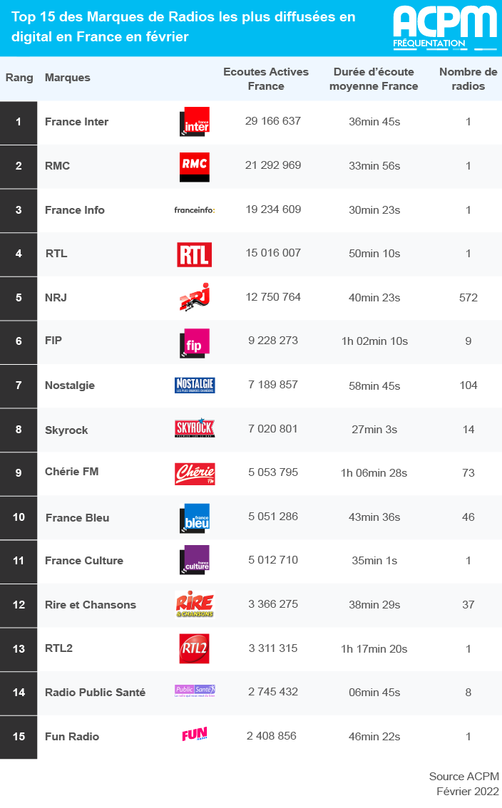 L’ACPM vient de publier les chiffres d’écoutes digitales des radios sur le mois de février 2022.