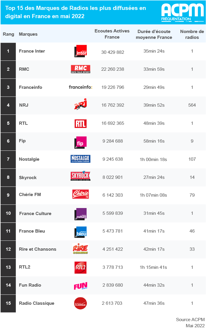 L’ACPM vient de publier les chiffres de la diffusion digitale des Radios de Mai 2022.