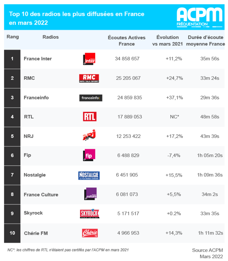 L’ACPM vient de publier la diffusion digitale des radios pour le mois de mars 2022.