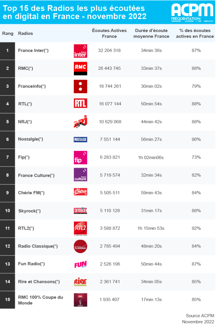 L’ACPM vient de publier les chiffres de la diffusion digitale Radio en France au mois de novembre 2022.