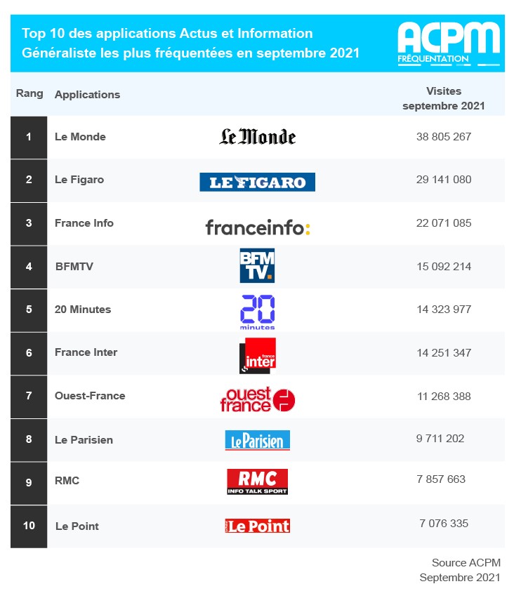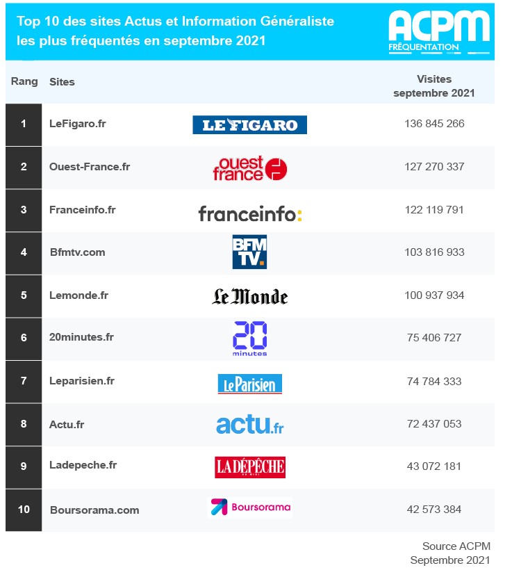 L’ACPM vient de partager les chiffres de fréquentation des sites et des applications certifiés sur le mois de septembre 2021.