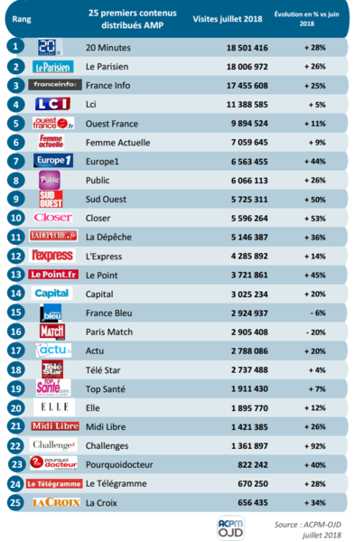 En ce mois de juillet, la consultation en mobilité explose. Notamment les sites AMP qui enregistrent près de 150 millions de visites sur le mois, soit une progression de 22% par rapport au mois précédent.