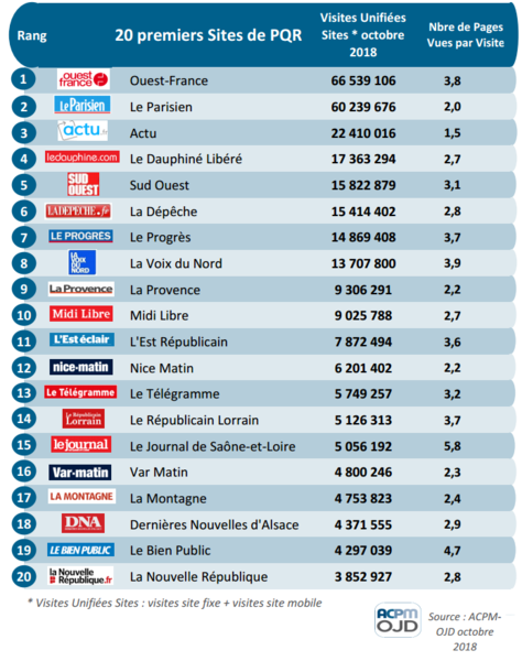 En octobre, les sites de la PQR totalisent près de 330 millions de visites. Ci-dessous les 20 premiers sites de la Presse Quotidienne Régionale sur ce mois d’octobre.