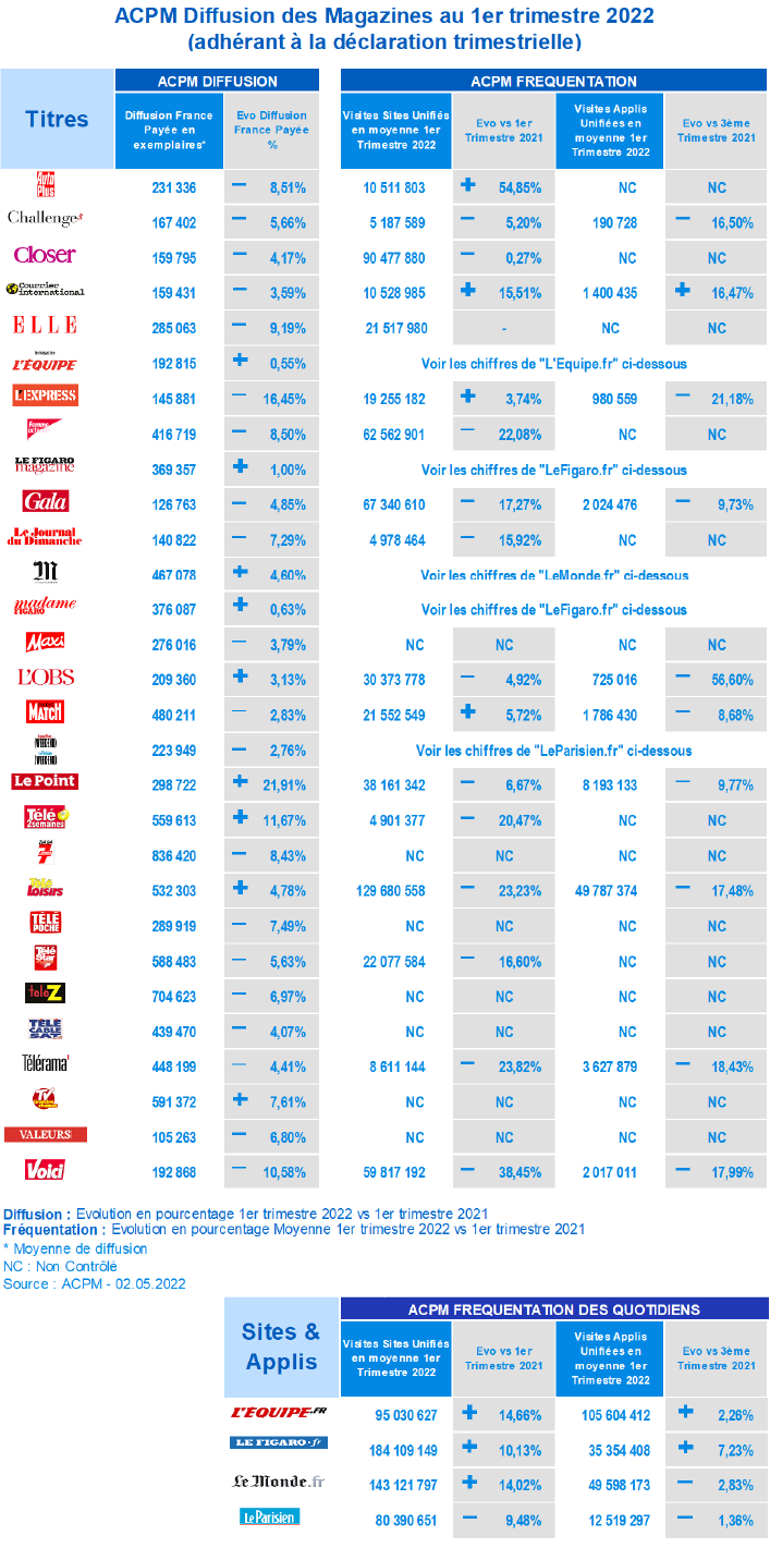 L’ACPM vient de publier les premiers chiffres de diffusion et de fréquentation des marques de presse magazine enregistrés au premier trimestre 2022 qui sont adhérentes aux déclarations trimestrielles.