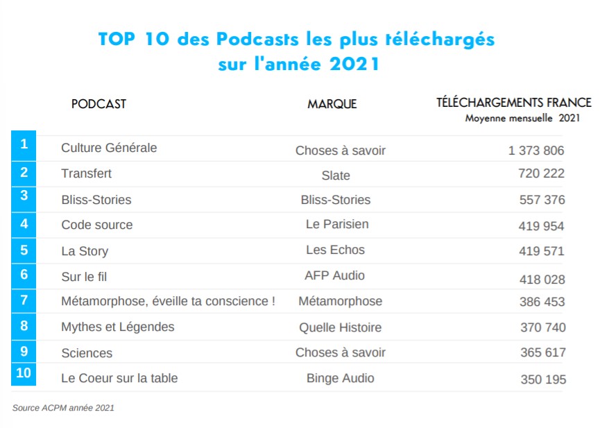 Le top 3 des catégories de podcasts les plus téléchargées sont : culture et société (avec 34.814.968 téléchargements), éducation (34.295.781 téléchargements) et actualités (23.179.490 téléchargements).