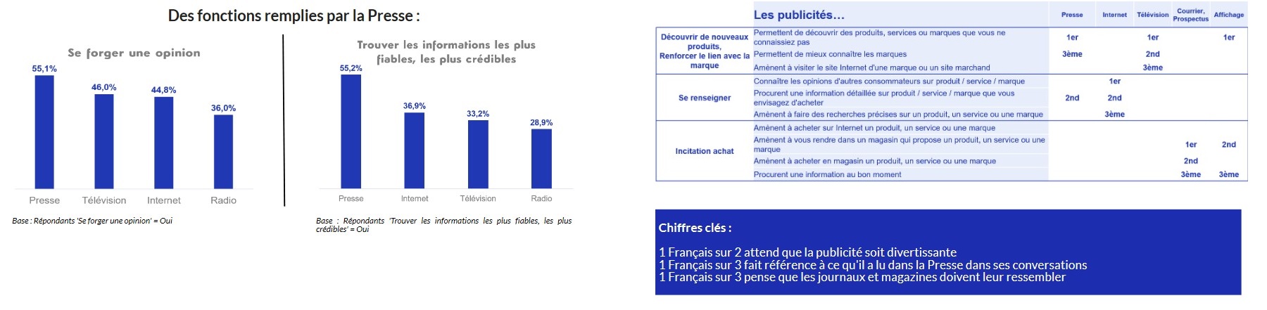 Les Français considèrent que les publicités dans la presse permettent avant tout de découvrir de nouveaux produits, services ou marques que les lecteurs ne connaissent pas. Elles procurent aussi des informations détaillées sur les produits/services et marques. Enfin, elles permettent de mieux connaître les marques.
