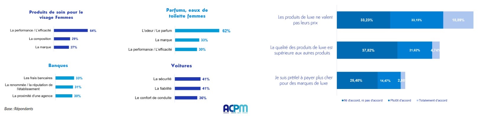 En matière de consommation dans le secteur du luxe, l’étude permet de savoir ce que pensent les Français du produit de marque en tant que tel. Il ressort que, bien que les produits ne semblent pas toujours valoir leurs prix, la qualité est malgré tout jugée supérieure aux autres par les consommateurs.