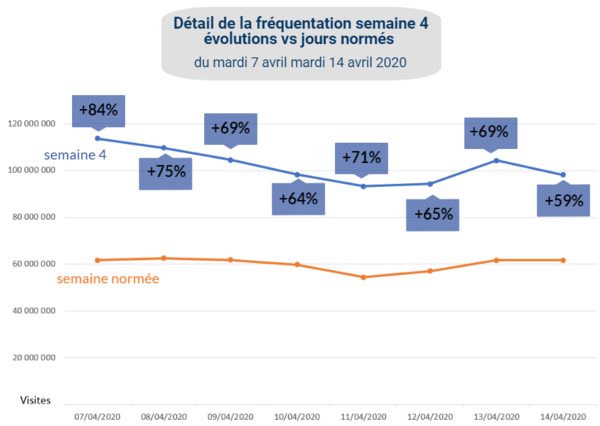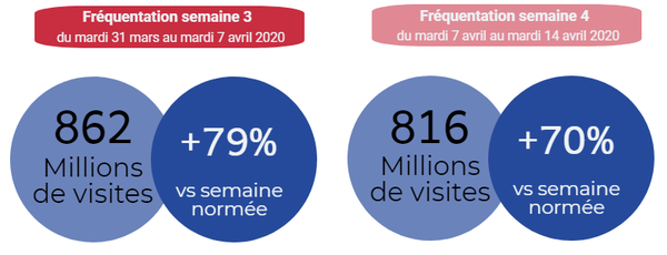 Sur la semaine 3 (31 mars-7 avril), la fréquentation s’élève à un total global de 862 millions de visites, soit +79% par rapport à une semaine normée alors que pour la semaine 4 (7 avril-14 avril), l’ACPM comptabilise 816 millions de visites (+70% par rapport à semaine normée).