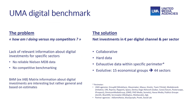 Le projet de digital benchmark de l’UMA avait pour objectif de répondre à une question : « Où en suis-je par rapport à mes concurrents ?», en apportant une solution simple : un calcul d’investissement net en euro par digital channel et secteur, transparent et anonymisé.