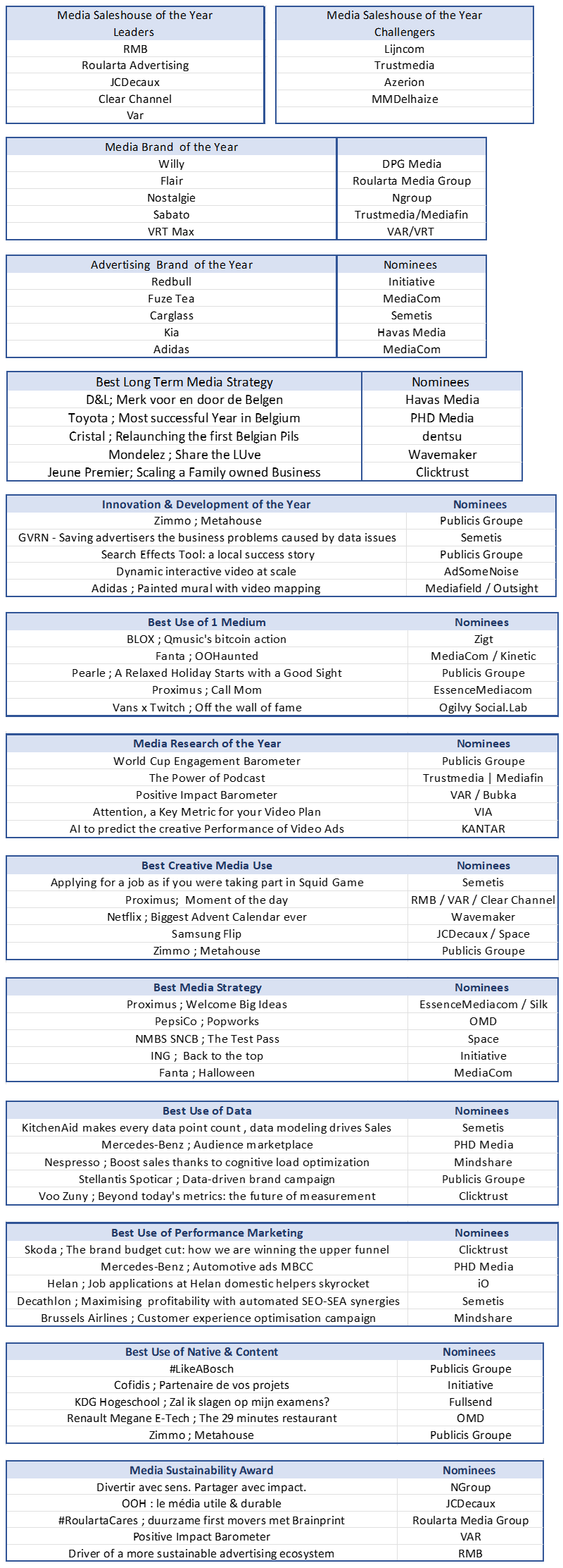Dans la catégorie Media Agency of the Year, les nominés sont : Semetis, Publicis Groupe et Outsight.