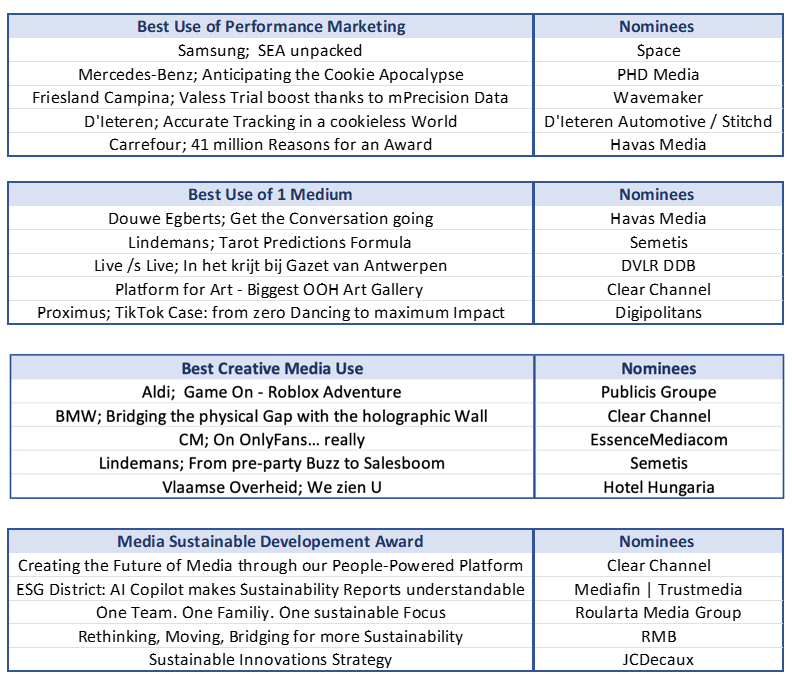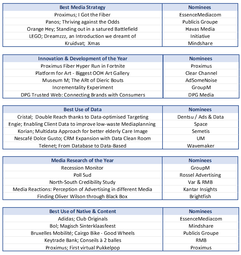 Après les délibérations, les jurys d’experts des AMMA ont nominé 45 dossiers dans 9 catégories. EssenceMediacom, Havas Media, Publicis Groupe et Semetis ont obtenu 3 nominations. GroupM, Mindshare, Space et Wavemaker voient 2 de leurs dossiers nominés. Parmi les régies, Clear Channel se démarque avec 4 nominations. Proximus se distingue par des nominations dans 4 catégories différentes.