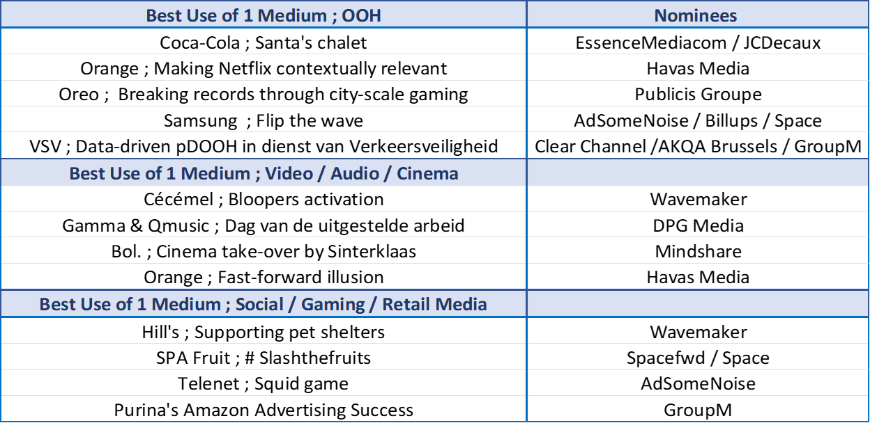 - Parmi les régies, JCDecaux se distingue avec des dossiers nominés dans 4 catégories différentes, suivi par Ads & Data et DPG Media avec 3 nominations.