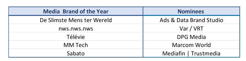 Sont nominés pour Media Brand of the Year, une reconnaissance pour les marques médias qui se distinguent par le développement réussi de leurs relations et interactions avec leurs publics cibles: