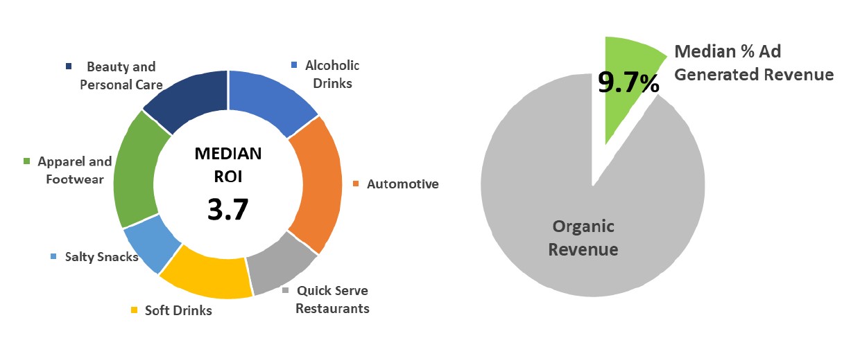 Le pourcentage médian de revenus générés par la publicité – qui s’élève en moyenne à 9,7 % pour toutes les marques et secteurs – varie de 5,1 % dans le secteur “Vêtements et Chaussures” à un remarquable 14,3 % dans le secteur “Beauté et Soins Personnels”.