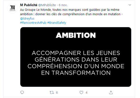 Innovations éditoriales, stratégies data, marketing prédictif, l’ambition était fervemment présente lors de la conférence sur la Brand Safety organisée par le groupe Le Monde, le 6 novembre dernier. « On vous dit toute la vérité », tweetait M Publicité.