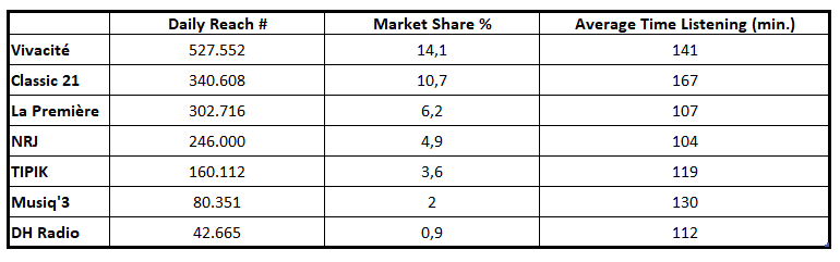 Vivacité est la station la plus écoutée quotidiennement sur les 12+, et touche pas moins de 527.000 individus. En part de marché commerciale, on observe une augmentation de près de 3%, ce qui marque la plus belle performance sur cette vague toutes stations francophones confondues. Vivacité est également la seconde station francophone en part de marché sur les 12+.