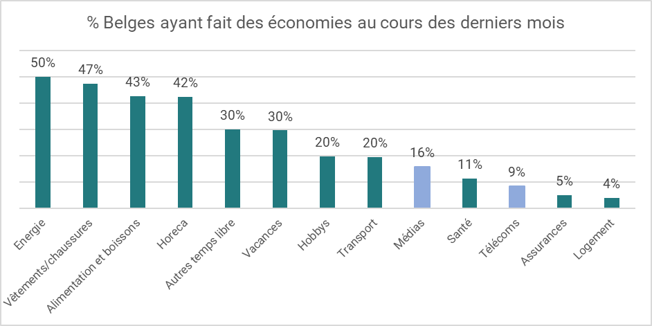 L’étude nous montre que les médias et télécommunications sont relativement épargnés : 16% des Belges disent avoir économisé dans les médias et seulement 9% dans les télécommunications. Ces secteurs semblent être considérés comme des nécessités. Ou les budgets sont peut-être trop restreints pour représenter une économie pertinente ?