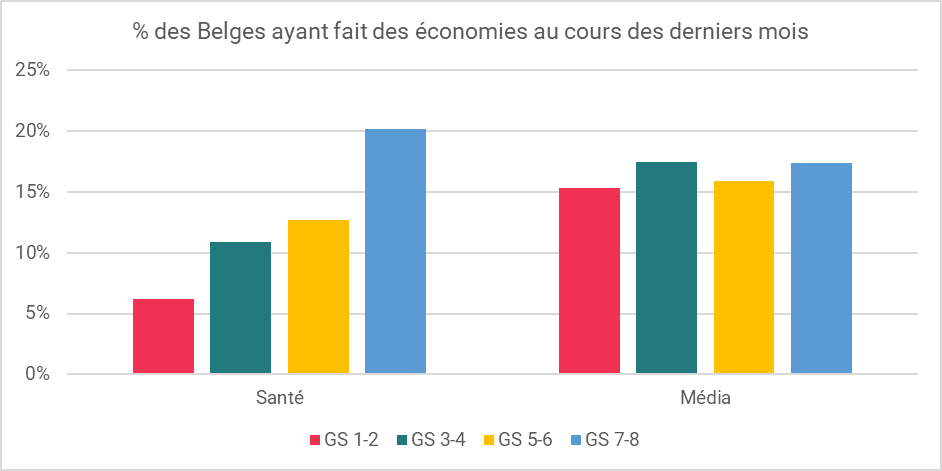 Si l’on approfondit au niveau des profils, on constate logiquement que les groupes sociaux les plus élevés (1 et 2) sont de façon générale moins impactés par la crise. L’analyse au niveau des secteurs montrent cependant que les différences entre groupes sociaux dépendent fortement des secteurs : les groupes sociaux les moins élevés économisent nettement plus dans des secteurs tels que la santé (voir ci-dessous) ou les assurances. Les économies dans le secteur des médias, par contre, sont plus « neutres » en termes des groupes sociaux (voir ci-dessous).