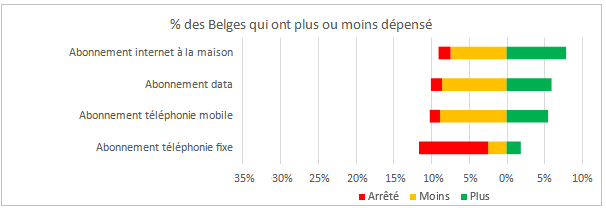 Le domaine des télécoms résiste plutôt bien à la crise. Certes, la tendance à arrêter les lignes de téléphonie fixe continue ou s’accélère : 9% des répondants affirment avoir arrêté leur ligne fixe ces derniers mois. Certains cherchent par ailleurs des abonnements moins chers. Mais seulement 1% ont arrêté leur abonnement data, 1% leur abonnement en téléphonie mobile et 2% leur abonnement Internet à domicile. La connectivité des Belges est devenue une nécessité.