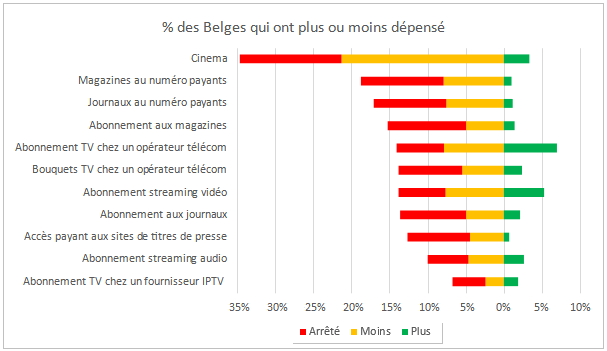 • Le cinéma : après une période difficile liée à la Covid, le cinéma subit directement les effets de cette nouvelle crise. 35% des Belges disent avoir dépensé moins ou avoir arrêté d’aller au cinéma, alors qu’ils sont seulement 3% à y avoir dépensé plus.