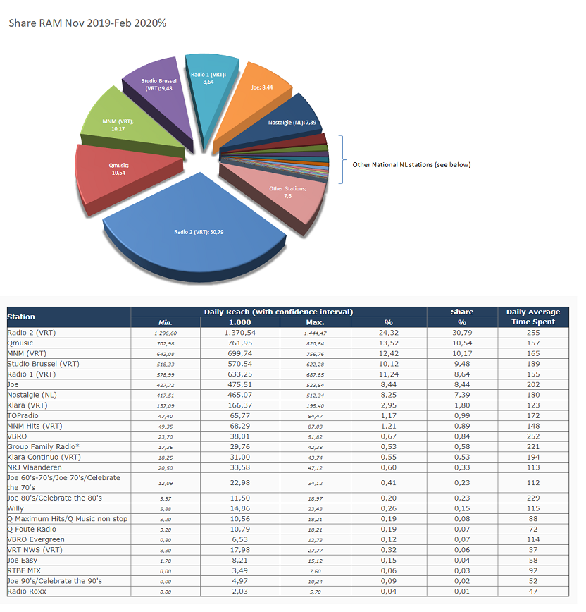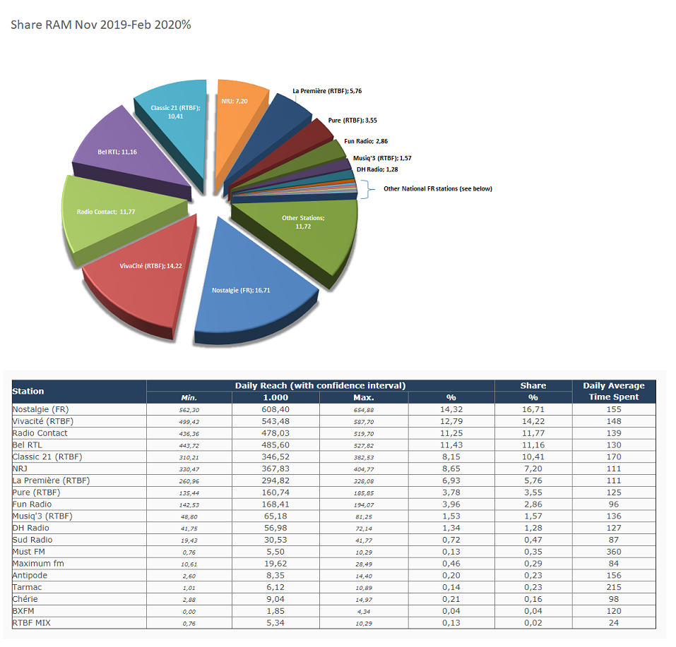 Le 21 avril, le CIM a livré les résultats des audiences radios (et des parts de marché) pour la période allant de novembre 2019 à février 2020. En Wallonie, une chaîne radiophonique attire entre 57.790 (DH Radio) et 590.930 auditeurs (Nostalgie).
