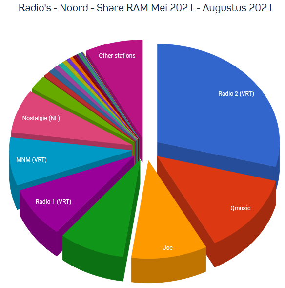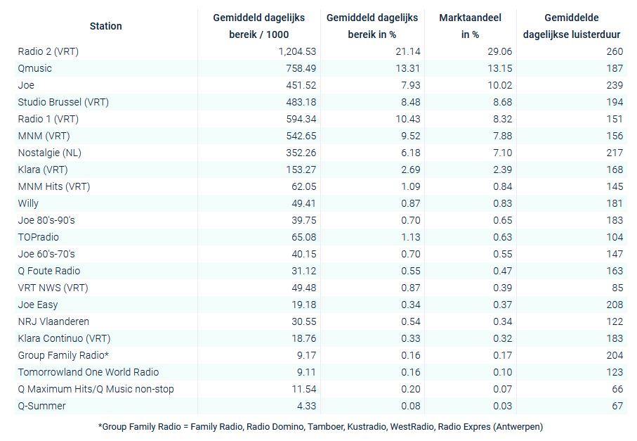 Côté néerlandophone, Radio 2 reste la radio la plus écoutée en Flandre avec une part de marché de 29,06%. Qmusic suit en deuxième position avec 13,15%. Joe occupe la 3e place avec 10,02%.