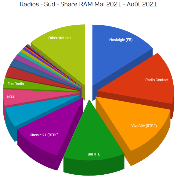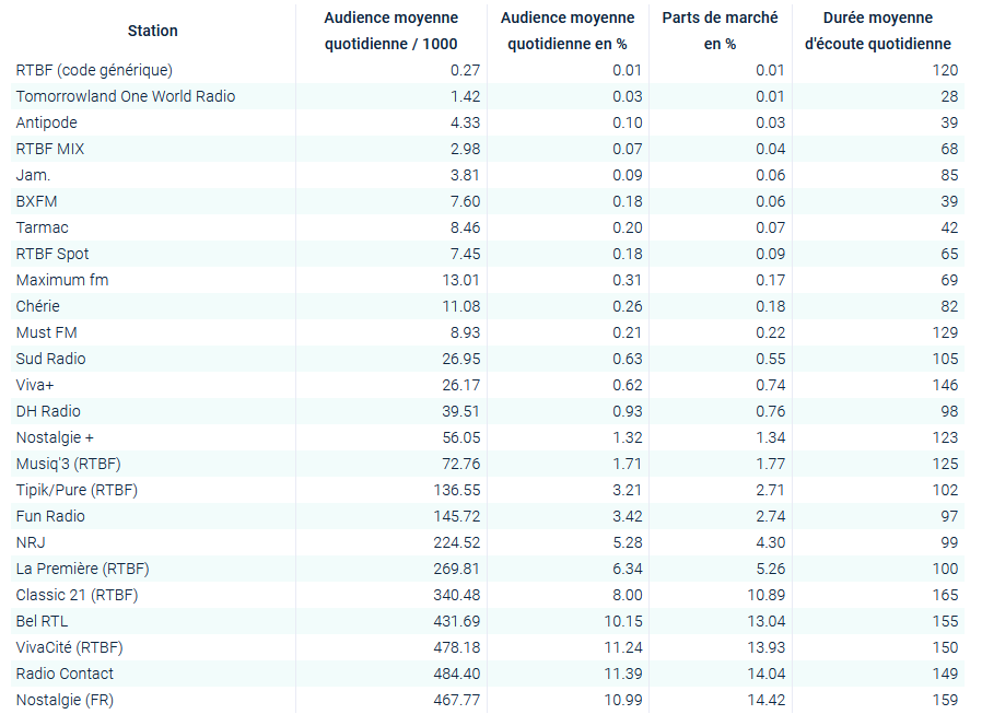 En Wallonie, Nostalgie est la radio la plus écoutée par les auditeurs. Elle se place en tête du classement avec 14,42% de parts du marché, suivie de Radio Contact (14,04%) et de Vivacité (13,93%).