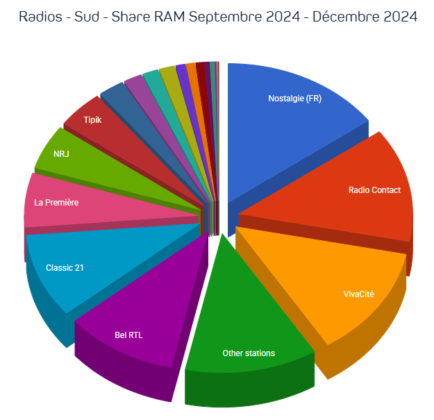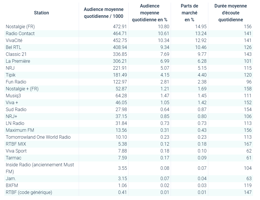 Les trois plus grandes stations de radio sont Nostalgie (14,92%), Radio Contact (13,24%) et VivaCité (12,92%).