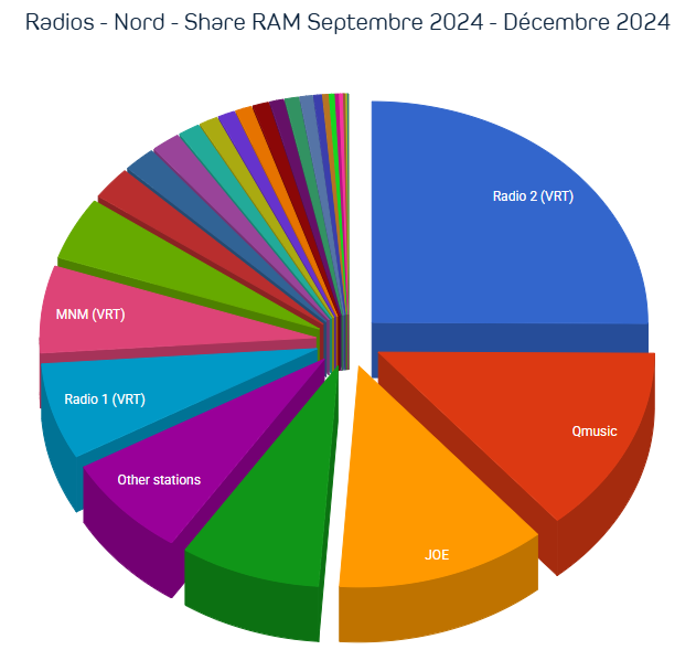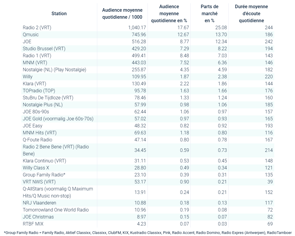 En Flandre, Radio2 reste la plus importante avec une part de marché de plus de 25,08%, suivie par Qmusic (13,70%) et JOE (12,34%).