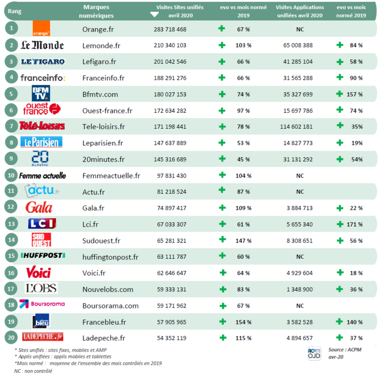 Classement ACPM/OJD : la fréquentation des Sites Internet a dépassé tous les records en avril