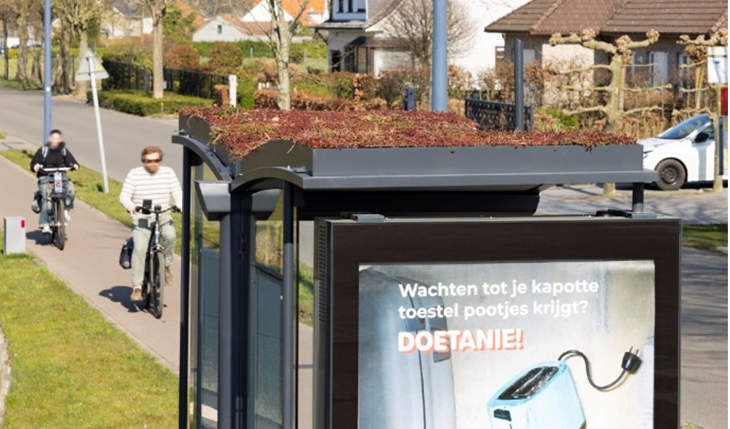 Tous les abris voyageurs sont dotés d’un toit végétalisé en sedum, une plante qui nécessite peu d’entretien et offre de nombreux bénéfices : réduction des particules fines, rétention d’eau de pluie, lutte contre les îlots de chaleur. Ces “mini-jardins suspendus” participent à la biodiversité urbaine : abeilles et papillons y trouvent refuge, tandis que les habitants profitent d’une vue plus verte et agréable sur leur environnement.