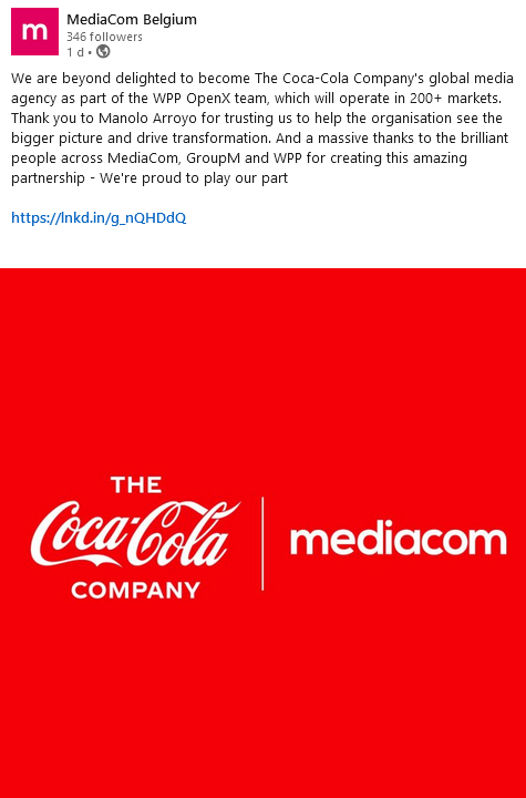 Gino Baeck, CEO de GroupM Belgium : “Comme dans le reste du monde, en Belgique, MediaCom et GroupM seront responsables de la stratégie, de la planification et de l’achat des marques Coca-Cola. Ce partenariat est une collaboration avec WPP OpenX et va au-delà des médias.”