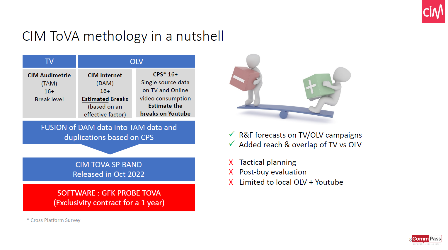 Pour la télévision, des travaux sont en cours sur l’évolution des chiffres de portée de la télévision vers la portée « Total Vidéo » dans CIM ToVA (qui inclut actuellement la télévision, la vidéo locale et YouTube), explique Remi Boel (Président de la Commission Télévision, Marketing Intelligence Director OMG). En outre, on cherche à savoir si l’habituel « horodatage » peut être remplacé par des fichiers « As Run ». L’horodatage est « l’enregistrement du temps qui établit le début et la fin de chaque élément d’une programmation, par exemple des programmes, des spots, des pauses, etc. ». Les fichiers « As Run », validés par Nielsen, pourraient constituer une alternative fiable, mais ne peuvent actuellement être utilisés que pour les programmes des principaux diffuseurs. À partir de 2023, un modèle hybride sera donc mis en place, qui combinera à la fois le time logging et les fichiers « As Run ». Remi Boel conclut en disant que l’OSU (other screen usage) prend de plus en plus d’importance : « Nous regardons aussi d’autres choses sur les écrans que du pur contenu télévisuel. » Il fait référence à Digital.i et à BARB, se demandant comment les intégrer dans CIM TAM, et attend également avec impatience XMC, le Consortium Crossmedial.