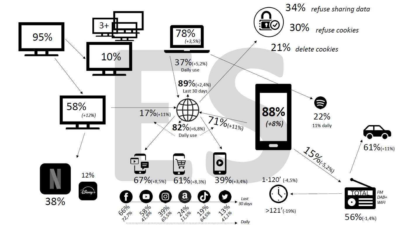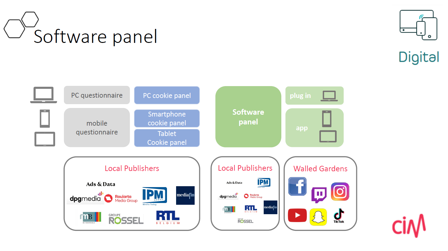 « Le digital, c’est un beetje van alles », dit Stéphanie Radochitzki (Présidente de la Commission Digital, Digital Strategy Director IPG Mediabrands). Le media digital est plus qu’un simple ensemble de pages constituant des sites. Il regroupe des pages, des streams vidéo ou audio, des applications, etc. L’étude CIM Internet permet de mesurer tout un ensemble de paramètres des pages vues, aux visites, en passant par la durée, grâce à une combinaison de méthodologies site centric et user centric (questionnaire posé aux internautes). Le cookie panel compte aujourd’hui plus de 70.000 cookies, qui servent de base à la modélisation de l’audience. Que mesure-t-on aujourd’hui ? Les éditeurs locaux, mais pas les « walled gardens » globaux que sont Facebook, Instagram, YouTube, Twitch, Snapchat, TikTok… Côté méthodologie, en 2022, le calcul des « Real Users » pour les applications a été amélioré (grâce au Device ID, qui offre plus de stabilité que les cookies), ainsi que la mesure des Real Users pour les apps qui utilisent le WebView, à mi-chemin entre un navigateur et une application, explique Stéphanie Radochitzki. Le principe est d’isoler ces WebViews users pour qu’ils ne soient plus comptés deux fois. Par ailleurs, Stéphanie Radochitzki fait référence à deux outils disponibles : eGemius (audiences sur cibles disponibles à J+1) et GfK Probe (version de base, pour la planification de campagnes digitales sur les sites et applications, et ToVA pour le planning stratégique TV + Online Vidéo). Enfin, la construction d’un software panel est en cours, afin de palier à la disparition progressive de l’utilisation des cookies et dans lequel les walled gardens globaux pourraient être également mesurés.