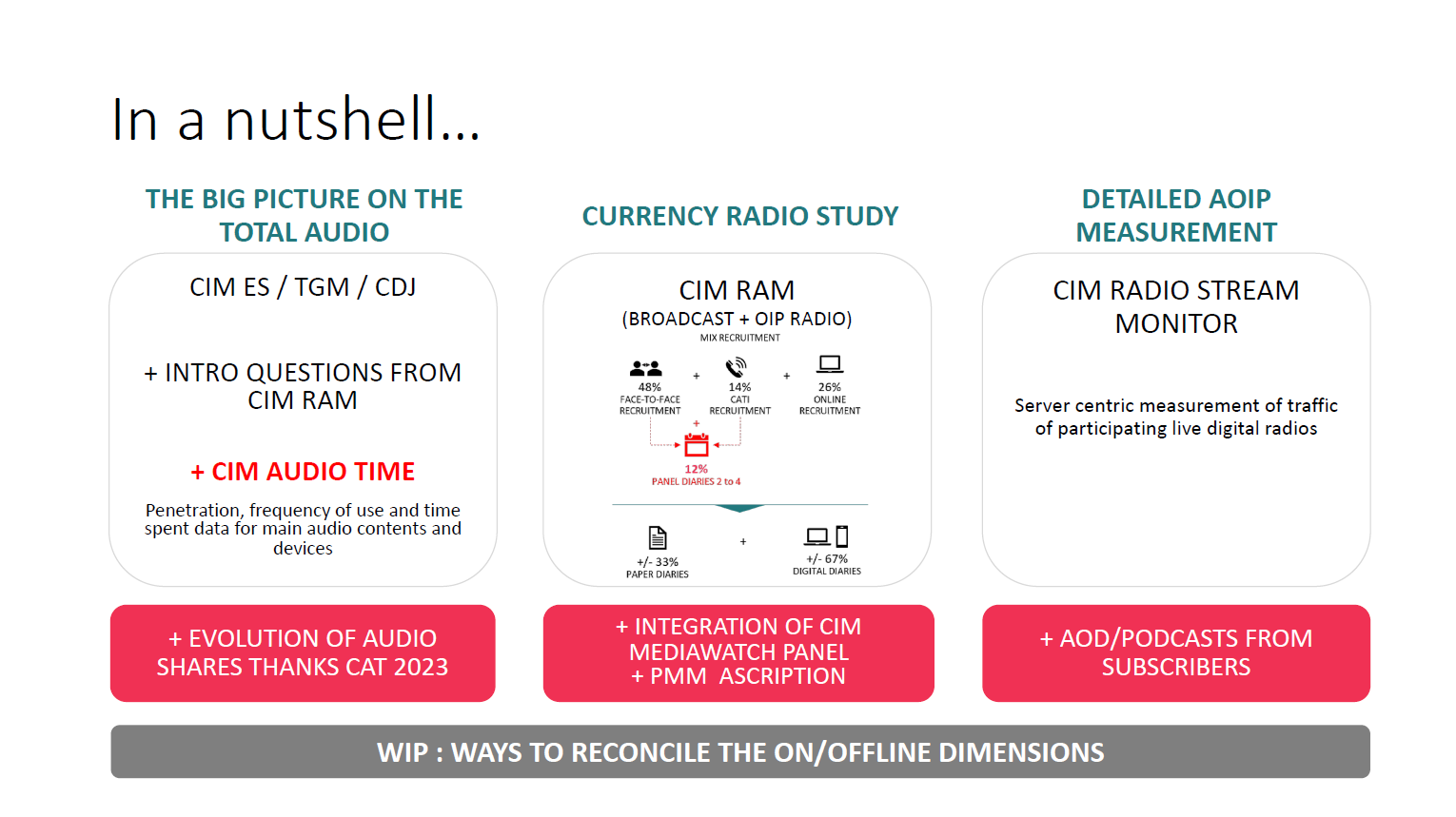 La continuité sera maintenue dans l’étude CIM RAM, avec un certain nombre de nouveautés, explique Stéphanie Piret (Présidente de la Commission Radio, Research Analyst OMG). À partir de la vague septembre-décembre 2022, des répondants du panel MediaWatch seront intégrés dans l’étude CIM RAM. L’objectif est que +/- 10% des observations de la vague soient issues de ce nouveau panel CIM, constitué au total de 5.500 personnes. Quant à l’audio digital, la mesure sera élargie avec le retour de CIM Audio Time en 2023. La première édition a eu lieu en 2022, donc dès la suivante, il sera possible d’observer les évolutions. Grâce à cette étude, nous avons notamment appris que 3% du temps d’écoute quotidien est consacré aux podcasts ou à la radio à la demande. « Mais nous ne savons pas encore combien de podcasts sont écoutés quotidiennement, hebdomadairement, mensuellement et quelles sont les marques de podcasts les plus populaires », précise Stéphanie Piret. « C’est pourquoi nous travaillons à intégrer les podcasts au sein du CIM Radio Stream Monitor en 2023. »