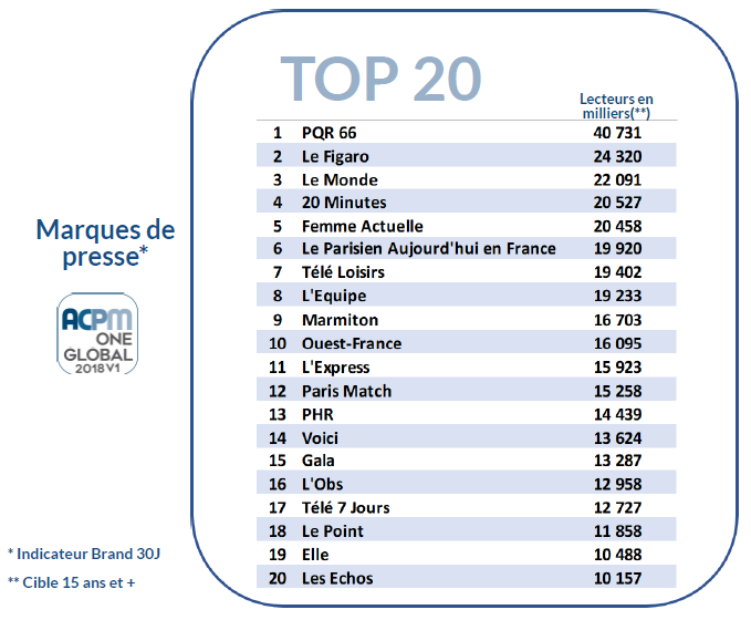 L’étude One Global 2017//2018 V1 révèle les chiffres d’audience des marques de presse. 97,1% de la population déclare lire la presse chaque mois (tous supports confondus). Cela représente 50,9 millions de lecteurs. L’audience moyenne des marques de presse est en hausse de 1,6% par rapport à la vague 2017 V4. 43% des lecteurs affirment toujours lire exclusivement le support print (-2 points). 15% déclarent lire exclusivement sur mobile, 15% sur ordinateur et 5% sur tablette. Les dupliquants représentent 22% de la répartition d’une marque de presse moyenne. Tous les chiffres ici.