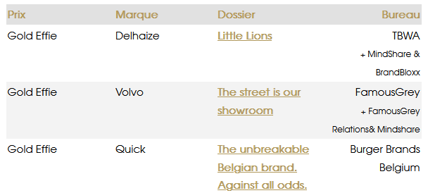 Le palmarès complet est disponible sur Effiebelgium.be.