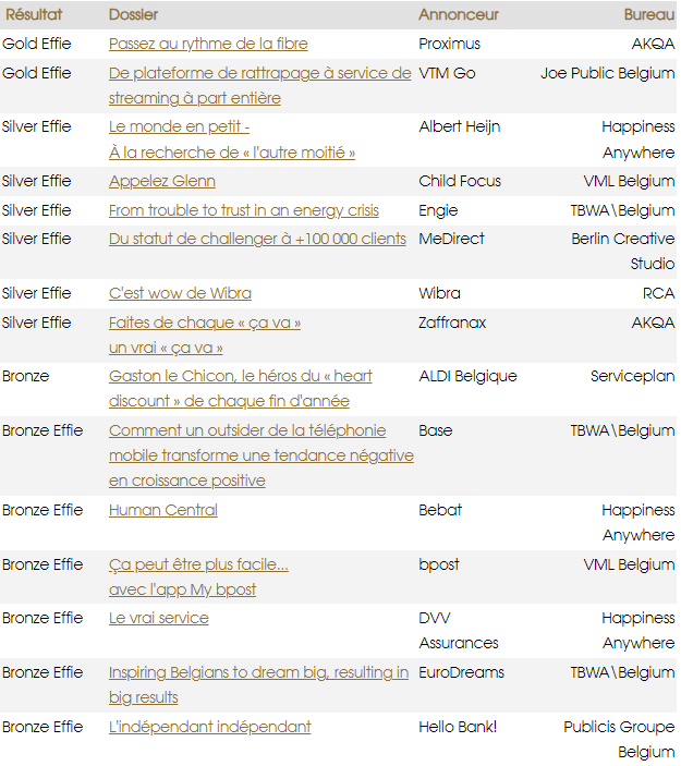 Les Effie d’argent ont été décernés à Zaffranax, MeDirect, Wibra, Child Focus, Albert Heijn et Engie.