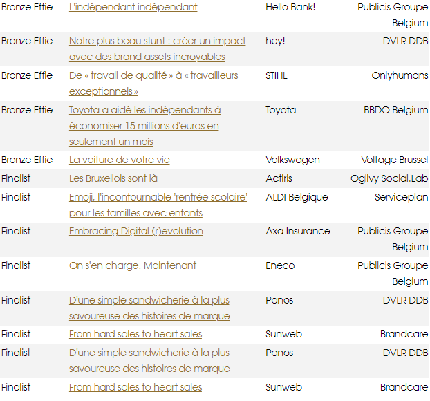 Au rang des Effie de bronze, on retrouve EuroDreams, Toyota, Volkswagen, hey !, STIHL, DVV Assurances, ALDI, Bebat, Hello Bank!Pro, bpost et BASE.
